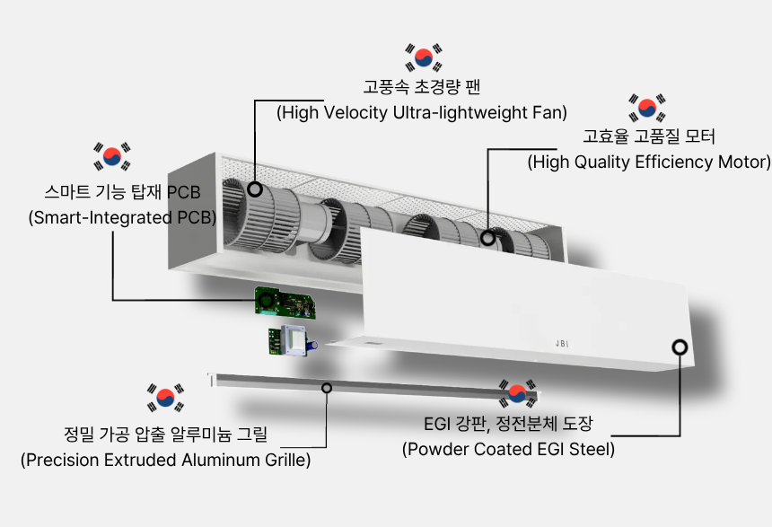 이곳저곳에 사용하는 낮은 품질이 아닌 JBI가 직접 설계하고 국내에서 정밀 공정으로 생산하여 한국의 전력 환경에 가장 최적화된 안정성을 제공합니다. 스마트 로직을 통한 최적화된 연동 알고리즘으로 문이 열리고 닫힘에 따라 최적의 공기막을 형성 합니다. 문이 닫히며 딸려오는 이물과 날벌레까지 차단하는 애프터 가드 기능이 포함 되어 있습니다.